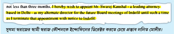 আগেই অভিযোগ উঠেছে, আর্থিক কেলেঙ্কারিতে অভিযুক্ত পলাতক প্রাক্তন আইপিএল কর্তা ললিত মোদীকে গত বছর জুলাইয়ে ব্রিটিশ ভিসা পাইয়ে দিতে সাহায্য করেছিলেন বিদেশমন্ত্রী সুষমা। নতুন তথ্য ফাঁসে আজ জানা গিয়েছে, ওই ঘটনার ঠিক এক মাস পরেই নিজের ব্যবসায়িক সংস্থা ইন্দোফিলের ডিরেক্টর হওয়ার জন্য সুষমার স্বামী স্বরাজ কৌশলের নাম প্রস্তাব করেছিলেন ললিত মোদী। ললিত প্রস্তাব দিয়েছিলেন, তাঁর অনুপস্থিতিতে কৌশলই তাঁর হয়ে সংস্থার কাজ সামলাবেন। যদিও স্বরাজ কৌশল শেষ পর্যন্ত সেই প্রস্তাব গ্রহণ না-করায় সেটি প্রত্যাহারও করা হয়। তবে ললিত মোদীর বাবা তথা ইন্দোফিলের কর্ণধার কে কে মোদী আজ স্বীকার করেছেন— স্বরাজ কৌশল তাঁদের নিয়মিত বেতনভোগীর তালিকাতেই ছিলেন।