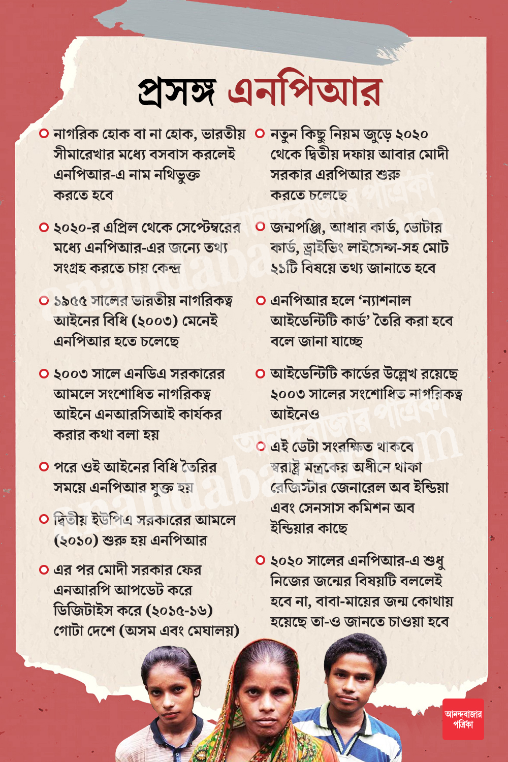 ২০১০ সালে প্রথম এনপিআর-এর মাধ্যমে ‘ডেটা’ সংগ্রহ করার প্রক্রিয়া শুরু হয়। তখন কেন্দ্রে ক্ষমতায় ছিল কংগ্রেস নেতৃত্বাধীন ইউএপিএ সরকার। ওই সময় যে ম্যানুয়াল বানানো হয়েছিল, সেখানে মুসলমানদের কোনও উৎসব-রীতির উল্লেখ ছিল না। ২০১৪ সালে বিজেপি ক্ষমতায় আসার পর, সেই অসম্পূর্ণ কাজ শেষ করার উদ্যোগ নেওয়া হয়। সেটা ২০১৫ সাল। পশ্চিমবঙ্গ-সহ বেশ কয়েকটি রাজ্যে এনপিআর-এর কাজ হয়েছে। ফের এক বার ২০২০ সালের এপ্রিল মাসে শুরু হতে চলেছে এনপিআর কর্মসূচি।