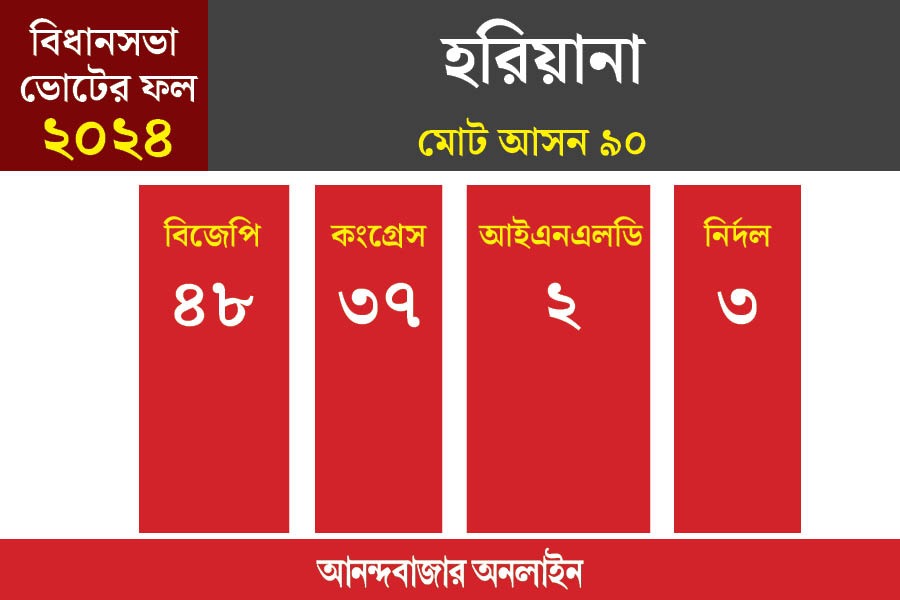 নির্বাচন কমিশনের তথ্য অনুযায়ী, ৪৮টি আসনে জয়ী হয়েছে বিজেপি। ৯০ আসনের হরিয়ানা বিধানসভায় সংখ্যাগরিষ্ঠতা পেতে দরকার ৪৬টি আসন। সেই সংখ্যা স্পর্শ করে ফেলেছে বিজেপি। কংগ্রেস জিতেছে ৩৭ আসন। ভোটগণণার শুরুতে হরিয়ানাতে এগিয়ে ছিল কংগ্রেস। তবে বেলা বৃদ্ধির সঙ্গে সঙ্গে সেই ছবি পাল্টে যায়।