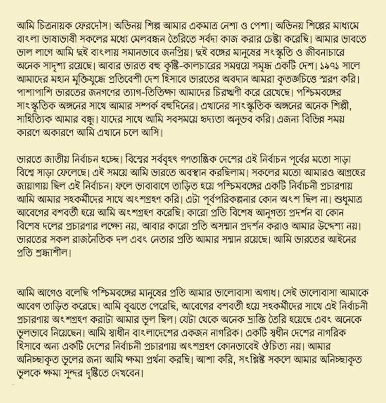 বিতর্কের মধ্যেই তৃণমূলের প্রচারে যোগদানের কথা স্বীকার করে ক্ষমা চেয়েছেন ফিরদৌস। বুধবার ঢাকা থেকে এক বিবৃতিতে ওই অভিনেতা জানান, ভারতের নির্বাচন নিয়ে বিশ্ব জুড়ে যে-কৌতূহলের সৃষ্টি হয়েছে, তিনিও তার অংশীদার। আবেগের বশে প্রচারে যোগ দিয়েছিলেন। সেটা যে ভুল, মেনে নিয়েছেন অভিনেতা।