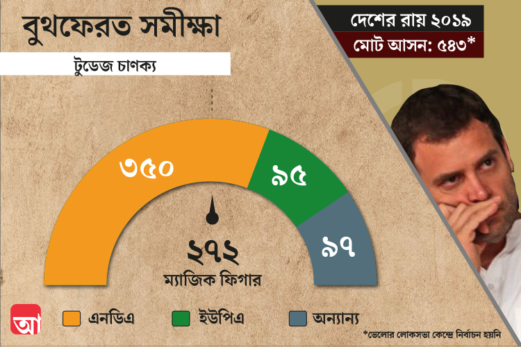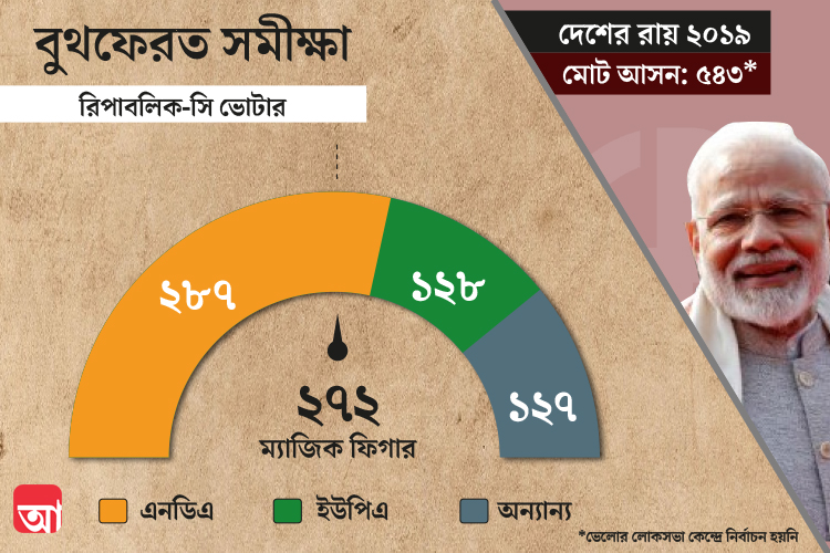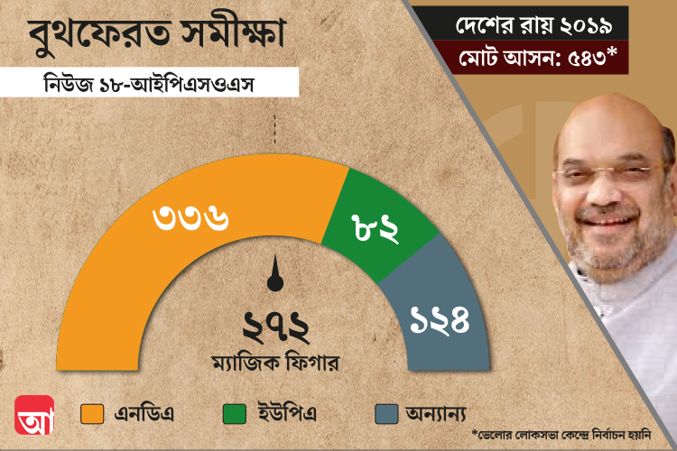 এবিপি নিউজ-নিয়েলসেনের মতে, এনডিএ ২৭৭টি আসন পেতে পারে। ইউপিএ ১৩০, আর অন্যরা ১৩৫টি। আবার ইন্ডিয়া টুডে-অ্যাক্সিস পোলের সমীক্ষা এনডিএ-কে ৩৩৯-৩৬৫টি আসন দিচ্ছে, ইউপিএ-কে ৭৭-১০৮টি। মোট ৫৪৩টি লোকসভা আসনের মধ্যে ভোট হয়েছে ৫৪২টিতে। মোট আসন ধরলে সংখ্যাগরিষ্ঠতার জন্য প্রয়োজন ২৭২টি আসন। দু’দিন আগেই দিল্লিতে বিজেপি দফতরে নরেন্দ্র মোদীকে পাশে নিয়ে বিজেপি সভাপতি অমিত শাহ দাবি করেছিলেন, বিজেপি একাই তিনশোটি আসন পার করবে। খোদ প্রধানমন্ত্রীও বলেন, বিজেপি এ বারেও পরপর দু’বার নিরঙ্কুশ সংখ্যাগরিষ্ঠতা পেতে চলেছে। ভারতের ইতিহাসে অনেক বছর পরে যা ঘটতে চলেছে।