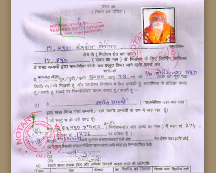 ফক্কড় বাবা ভোটে লড়তে ৭৩ বসন্ত পার করে ফেলেছেন। পেশায় সাধু বা সন্ত। মথুরার গলতেশ্বর মন্দিরের প্রধান পুরোহিত। পুজোপাঠ আর অন্যের দরজায় ভিক্ষে করেই ‘কষ্টেসৃষ্টে দিন চলে যায়’। এখন অবশ্য দোরে দোরে গিয়ে ভোট ভিক্ষা করে ফিরছেন। এ বারও গত ২৬ মার্চ নির্বাচন কমিশনে মনোনয়ন জমা দিয়ে ফেলেছেন। মনোনয়ন জমা নেওয়া শুরু হওয়ার পর প্রথম দিনই। তার আগে জয়ের প্রার্থনা করে পুজো দিয়েছেন যমুনায়।