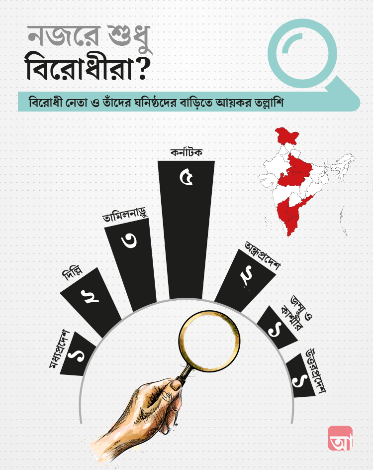 বিরোধী নেতা এবং তাঁদের ঘনিষ্ঠদের লক্ষ্য করে গত ছ’মাসে যে ১৫টি অভিযান চালিয়েছে আয়কর দফতর, তার মধ্যে পাঁচটি কর্নাটকে, তিনটি তামিলনাড়ুতে, দু’টি অন্ধ্রপ্রদেশে, দু’টি দিল্লিতে এবং একটি করে অভিযান চালানো হয়েছে মধ্যপ্রদেশ, জম্মু ও কাশ্মীর এবং উত্তরপ্রদেশে।