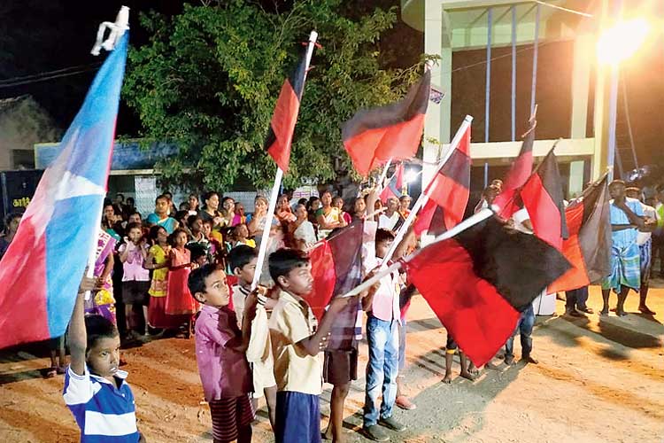 এলাকার মানুষ অর্থাৎ সান্দেরগিরি, কাটনায়কমপট্টি, মানথিথোপ্পুর বাসিন্দারা কী বুঝলেন কে জানে, সমবেত ভাবে মাথা নাড়তে শুরু করলেন। আচমকাই বিভিন্ন বাড়ি থেকে খালি গায়ে হাঁটু পর্যন্ত ধুতি গুটিয়ে বেরিয়ে এলেন এক দল পুরুষ। গলায় ঢোল। শুরু হল উদ্দাম বাজনা। হাতে ডিএমকে-র পতাকা নিয়ে সার সার দাঁড়িয়ে পড়ল ছেলেমেয়েরা। যাদের বয়স চার থেকে দশের ভিতরে। রাত তখন প্রায় ৯টা। স্কুল-পড়ুয়া শিশুদের রাজনৈতিক মিছিলে শামিল করা নিয়ে কত বিতর্কই হয়েছে কলকাতায়! তামিলনাড়ুর বন্দর এলাকার প্রত্যন্ত গ্রামে ওই রাতে স্কুলপড়ুয়া শিশুদের রোড শো-য়ে শামিল করা নিয়ে প্রতিবাদ করার অবশ্য কেউ ছিলেন না।