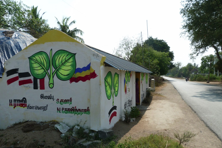 পশ্চিমঘাট পর্বতের কোলে বাড়ির দেওয়ালে এআইএডিএমকের প্রতীক আঁকা।