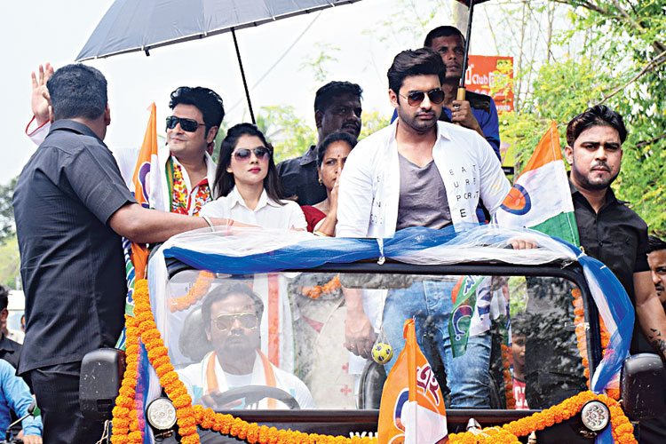 রায়গঞ্জে অভিনেতা অঙ্কুশ ও পায়েলের সঙ্গে প্রচারে ফিরদৌস (বাঁ দিকে)। ছবি: চিরঞ্জীব দাস