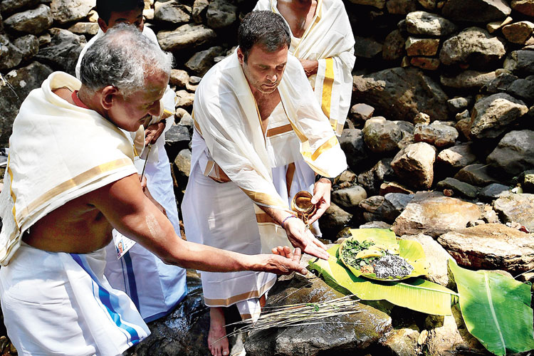 প্রার্থনা: দ্বিতীয় দফায় ভোটের আগে ওয়েনাডে পুজো দিচ্ছেন রাহুল গাঁধী। বুধবার। ছবি: পিটিআই।