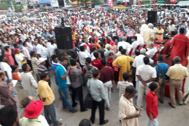 খড়দহে রবীন্দ্র ভবনের সামনে ইয়েচুরির সভা ঘিরে ভিড়। নিজস্ব চিত্র