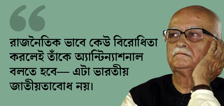 যদিও এর পরেই সব থেকে বিস্ফোরক অংশটি পাওয়া গিয়েছে তাঁর লেখায়। যেখানে তিনি লিখেছেন, ‘রাজনৈতিক ভাবে কেউ মতের বিরোধী হলেই তাঁকে অ্যান্টিন্যাশনাল বলা হবে, এই বিশ্বাস কোনও দিন ছিল না বিজেপির মধ্যে।’ এ ছাড়া দলের মধ্যে গণতন্ত্র প্রতিষ্ঠার বিষয়টিও বেশ কয়েক বার নিজের লেখায় ছুঁয়ে গিয়েছেন আডবাণী।