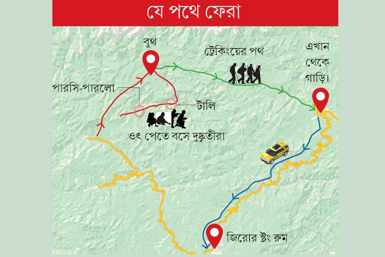 দারাং জানান, পথে ৮টি পাহাড় টপকাতে হয়েছে তাঁদের। প্রতিদিন রাত তিনটেয় হাঁটা শুরু হতো, পরের গন্তব্যে পৌঁছতেন মাঝ রাতে। রাস্তায় সঙ্গী ছিল বৃষ্টি, জোঁক আর পাহাড়ি ডামডুম মাছি। শেষ পর্যন্ত তাঁরা জিক্কে গ্রামে পৌঁছন। সেখানেই অপেক্ষায় ছিলেন ডিএসপি কামদাম সিকম। গাড়িতে দাপোরিজো নিয়ে যাওয়া হয় সকলকে। সেখান থেকে কনভয়ের সুরক্ষায় ইভিএম-সহ গোটা দলটিকে নামনি সুবনসিরি জেলার জিরোয় নিয়ে আসা হয়।