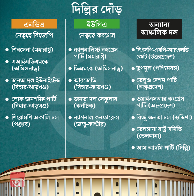 এক মাসেরও বেশি সময় ধরে সাত দফার লোকসভা নির্বাচন শেষ। এ বার ফল ঘোষণার দিকে নজর সবার। তার আগে যদিও বুথফেরত সমীক্ষা নিয়ে জোর চর্চা চলবে। তবে রাজনৈতিক দলগুলির অন্দরে এখনই শুরু হয়ে গিয়েছে বুথফেরত সমীক্ষা ভোট পরবর্তী সমীকরণের চর্চা। তবে দৌড়ে মূলত তিনটি গোষ্ঠী বা জোট। প্রথমত, বিজেপির নেতৃত্বে ফের এনডিএ সরকার, দ্বিতীয়ত পুনরুত্থান হতে পারে কংগ্রেসের নেতৃত্বে ইউপিএ জোটের। আঞ্চলিক দলগুলির ফেডারেল ফ্রন্টের সম্ভাবনাও উড়িয়ে দিচ্ছেন না পর্যবেক্ষকদের অনেকে।