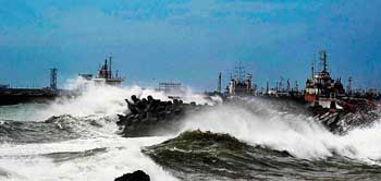 হুদহুদে উত্তাল সমুদ্র। রবিবার বিশাখাপত্তনমে। ছবি: পিটিআই