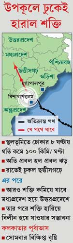 ওড়িশা ও অন্ধ্র দিয়ে যাতায়াত করে এমন ৫১টি ট্রেন বাতিল হয়েছে সারা দিনে। সমান বিপর্যস্ত উড়ান পরিষেবাও। আবহাওয়া দফতর সূত্রে খবর, এ বার ঝাড়খণ্ডের দিকে যাওয়ার কথা হুদহুদের। পথে হাওয়ার গতি ঘণ্টায় ১০০ কিলোমিটারে নেমে আসতে পারে। অন্ধ্রে আগামী তিন দিন ভারী বৃষ্টি হবে বলে সতর্ক করেছে আবহাওয়া দফতর। ঝড়ের তেমন দাপট না থাকলেও আগামী তিন দিনে ভারী থেকে অতি ভারী বৃষ্টি হবে ঝাড়খণ্ডে। বৃষ্টির সম্ভাবনা রয়েছে বিহার, মধ্যপ্রদেশ আর গাঙ্গেয় পশ্চিমবঙ্গেও।
