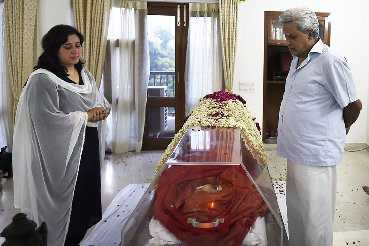 বাড়িতে শেষ শয্যায়। এক পাশে স্বামী স্বরাজ কৌশল, অন্য় পাশে কন্যা বাঁসুরি স্বরাজ। ছবি- পিটিআই