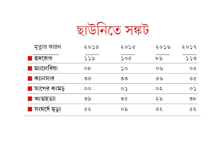 জঙ্গি হামলা বা মাওবাদীদের সঙ্গে সংঘর্ষে নয়, ফি বছর দেশের বিভিন্ন প্রান্তে মোতায়েন আধা সামরিক বাহিনীর জওয়ানদের মধ্যে শারীরিক অসুস্থতার কারণে মৃত্যুর সংখ্যা অনেক বেশি বলে সাম্প্রতিক রিপোর্টে দেখা যাচ্ছে। স্বরাষ্ট্রমন্ত্রকের তরফে করানো সমীক্ষা রিপোর্টে বলা হয়েছে, অস্বাস্থ্যকর পরিবেশ, মানসিক অবসাদ, সঠিক চিকিৎসা ও ওষুধের অভাব, এইচআইভি সংক্রমণ আধা সামরিক বাহিনীর জওয়ানদের মৃত্যুর বড় কারণ। রিপোর্টে দেখা গিয়েছে, গত দু’বছরে (২০১৬ ও ২০১৭) সালে হার্ট অ্যাটাকে ৮৯ ও ১১৩ জন জওয়ান মারা গিয়েছেন। সংঘর্ষজনিত কারণে ওই সময়ে ৪২ ও ৫২ জন প্রাণ হারিয়েছেন। মৃত্যুর কারণ হিসাবে উঠে এসেছে ম্যালেরিয়া, ক্যানসার ও সাপের কামড়ও। অসম রাইফেলস-এ সাম্প্রতিক সময়ে এইচআইভি সংক্রমণের ২৪টি ঘটনা সামনে এসেছে। উত্তর-পূর্ব ভারতে মোতায়েন ওই বাহিনীর জন্য অবিলম্বে সচেতনতা কর্মসূচি বাড়ানোর উপরে সুপারিশ করা হয়েছে ওই রিপোর্টে।