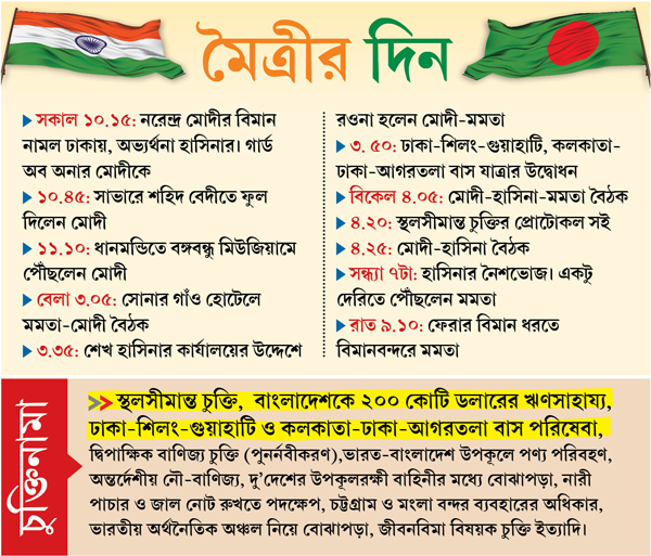 ভোজসভায় যেতেই হল মুখ্যমন্ত্রীকে। সঙ্গে নিয়ে গিয়েছিলেন মন্ত্রী অরূপ বিশ্বাসকে। মোদীর সঙ্গে আলাপ করিয়ে দিলেন তাঁকে। হাসিনাকে বললেন, ‘‘এ আমার মন্ত্রী অরূপ।’’ অরূপকে বললেন, ‘‘পায়ে হাত দিয়ে প্রণাম কর!’’ সঙ্গে সঙ্গে ঢিপ করে প্রণাম করলেন অরূপ। মমতা অবশ্য খেলেন যৎসামান্য। স্যুপ আর একটু ঢোকলা। যেন কথা রাখতেই খাওয়া। শাড়ি বদলানোর সময়টুকুও পাননি। বিমানবন্দরে উপস্থিত সাংবাদিকদের এক নিঃশ্বাসে শুধু একটা কথাই বলতে পারলেন, ‘‘আজ ঐতিহাসিক চুক্তি স্বাক্ষর করেছে দুই দেশ। এতে সকলেরই উপকার হবে।’’