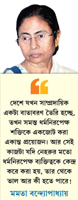 মমতা নিজে অবশ্য দাবি করছেন, নেহরুর জন্মবার্ষিকীর অনুষ্ঠানকে সঙ্কীর্ণ দলীয় রাজনৈতিক দৃষ্টিভঙ্গি থেকে দেখা ঠিক হবে না। কিন্তু বিজেপি-জুজু যে তাঁকে তাড়া করে ফিরছে সেই ইঙ্গিত দিয়ে একই সঙ্গে তিনি বলছেন, “দেশে যখন সাম্প্রদায়িক একটা বাতাবরণ তৈরি হচ্ছে, তখন সমস্ত ধর্মনিরপেক্ষ শক্তিকে একজোট করা একান্ত প্রয়োজন। আর সেই কাজটা যদি নেহরুর মতো ধর্মনিরপেক্ষ ব্যক্তিত্বকে কেন্দ্র করে করা হয়, তার থেকে ভাল আর কী হতে পারে!”