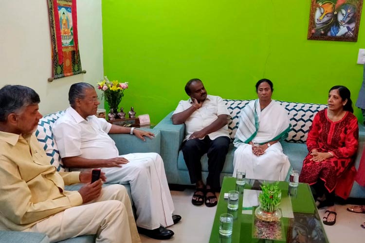 (বাঁ দিক থেকে) অন্ধ্র্প্রদেশের মুখ্যমন্ত্রী চন্দ্রবাবু নাইডু, কেরলের মুখ্যমন্ত্রী পিনারাই বিজয়ন, কর্নাটকের মুখ্যমন্ত্রী কুমারস্বামীর সঙ্গে দিল্লিতে বৈঠকে মমতা বন্দ্যেপাধ্যায়। —পিটিআই