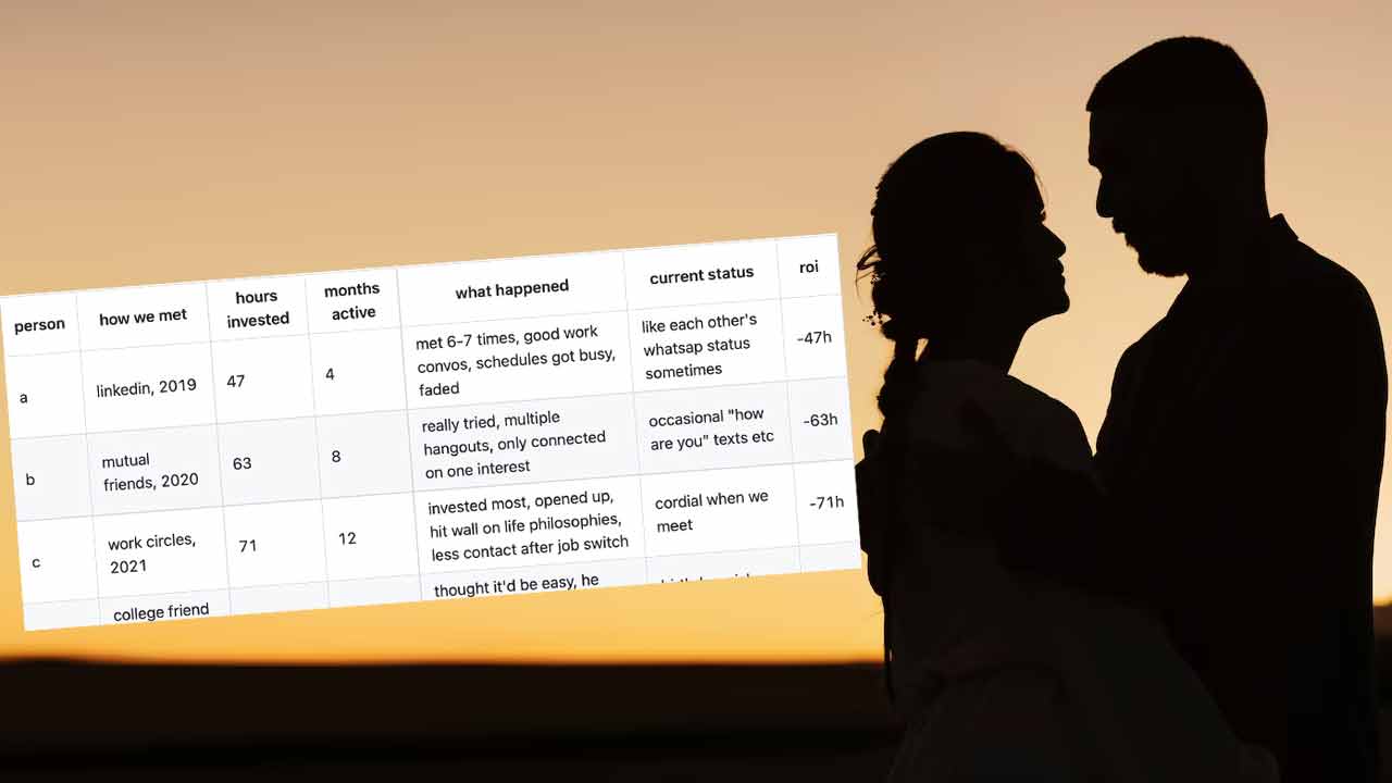একটা সময়ে তিনি বুঝতে পেরেছিলেন যে, তিনি যাঁদের বন্ধু বলে মনে করেন, তাদের মধ্যে মাত্র ছ’জন তাকে ঠিক ভাবে বোঝেন এবং চেনেন। সেই আবেগের ‘ব্যান্ডউইথ’ মূল্যায়ন করেছেন এক্সেল শিটে।