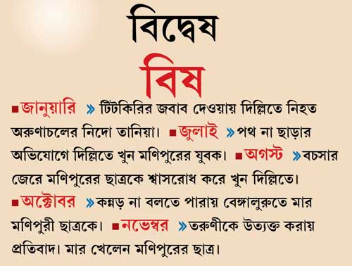 এ বছরের গোড়ায় শুরু। দিল্লিতে জাতি-বিদ্বেষের জেরে খুন হতে হয় অরুণাচলপ্রদেশের ছাত্র নিদো তানিয়াকে। তা নিয়ে দেশজুড়ে প্রতিবাদ হলেও উত্তর-পূর্বের মানুষের উপরে নিগ্রহের ঘটনা কিন্তু বন্ধ হয়নি।