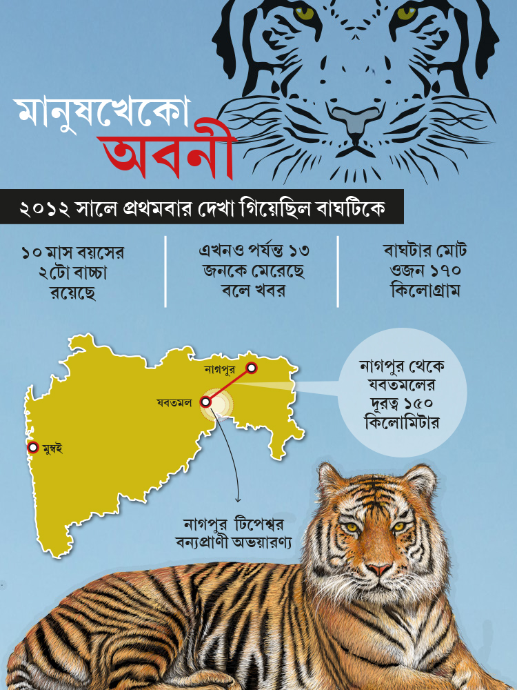 হঠাৎই মানুষখেকো হয়ে ওঠায় মহারাষ্ট্রের পান্ধারকাওড়া জঙ্গল আর তার আশপাশের এলাকায় গত দু’বছরে অবনীর পেটে যান কম করে ১৩ জন। ফলে, গোটা এলাকায় ত্রাস হয়ে উঠেছিল অবনী। গত সেপ্টেম্বরে সুপ্রিম কোর্ট তার একটি রায়ে অবিলম্বে মেরে ফেলতে বলে অবনীকে। কিন্তু গত তিন মাস ধরে তন্নতন্ন তল্লাশি চালিয়েও রালেগাঁওয়ের গভীর জঙ্গলে বাঘিনী অবনীর হদিশ পাচ্ছিলেন না মহারাষ্ট্রের বন দফতরের পদস্থ কর্তা, কর্মীরা।