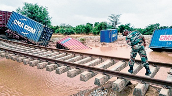 বন্যার জেরে বিপজ্জনক অবস্থায় ঝুলছে রেললাইন। রবিবার রাজস্থানের সিরোহি জেলার ধনেরায়। ছবি: পিটিআই।