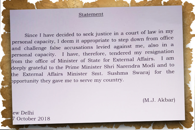 পদত্যাগপত্রে আকবর লিখেছেন, ‘‘যেহেতু আমি ব্যক্তিগত ভাবে আদালতে বিচার চেয়েছি, তাই বিচারের স্বার্থে আমি আমার কার্যভার (পড়ুন, মন্ত্রিত্ব) থেকে ইস্তফা দেওয়াটাই সমীচীন মনে করছি। আমার বিরুদ্ধে যে সব মিথ্যা অভিযোগ করা হয়েছে, তার বিরুদ্ধে আমি ব্যক্তিগত ভাবেই আইনি লড়াই লড়তে চাই। তাই আমি বিদেশ প্রতিমন্ত্রীর পদ থেকে ইস্তফা দিচ্ছি।’’