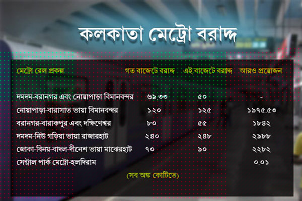 বাজেট বরাদ্দ তেমন ভাল হয়নি মেট্রো প্রকল্পগুলোর ক্ষেত্রেও। এ বছর নির্বাচন সামনে থাকায় রাজ্য সরকার যখন এই সব প্রকল্পের ব্যাপারে কিছুটা সক্রিয় ভূমিকা নিয়েছে তখন বরাদ্দ কমে গিয়ে দাঁড়িয়েছে ৫৬৮ কোটি টাকায়।