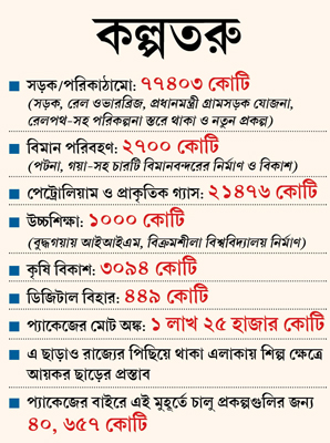 বিজেপির কেন্দ্রীয় নেতৃত্বের বক্তব্য, এর আগে বিহার সফরে এসে ‘ডিএনএ’ এবং ‘বিমারু’ বলে দু’টি বিতর্ক তৈরি করে গিয়েছিলেন মোদী। সেই দুই অস্ত্র ব্যবহারে উঠেপড়ে লেগেছেন নীতীশ। কয়েক লক্ষ ডিএনএ-র নমুনাও জোগাড় হয়েছে। এ সব থেকে চোখ ঘুরিয়ে দিতে ‘ধামাকা’ দরকার ছিল মোদীর। এক লক্ষ ২৫ হাজার কোটি টাকার যে উপহার তিনি এ দিন দিলেন বিহারকে, তা এক অর্থে ধামাকাই। তবে ভোটের রাজনীতি করতে গিয়ে প্রধানমন্ত্রী যে উন্নয়নের বদলে ভেটের দিকেই ঝুঁকে পড়লেন, তাও মেনে নিচ্ছে দল। এই সওয়া লক্ষ কোটি টাকার প্রকল্পে সড়ক, বিমানবন্দরের মতো কিছু পরিকাঠামোগত প্রকল্প রয়েছে ঠিকই, কিন্তু বিহারে উন্নয়নে গতি বাড়াতে শিল্পমহলের জন্য কোনও ছাড়ের ঘোষণা নেই। বরং ভোট-বালাইয়ের কথাই মনে পড়িয়ে দিচ্ছে এই বিপুল প্যাকেজ।