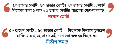 আরায় সরকারি অনুষ্ঠানের মঞ্চ থেকে ঘোষণাটিও মোদী স্বভাবসিদ্ধ ভঙ্গীতে নাটকীয় ভাবেই করেছেন এ দিন। প্যাকেজের পরিমাণ নিয়ে আগাম কোনও ইঙ্গিত ছিল না। মোদী সভায় হাজির জনতাকে সঙ্গে নিয়ে ধাপে ধাপে উঠলেন এই লক্ষ-কোটির অঙ্কে। সেই মঞ্চে তখন উপস্থিত নীতীশ কুমারের অত্যন্ত ঘনিষ্ঠ, রাজ্যের পূর্তমন্ত্রী রাজীব রঞ্জন ওরফে ললন সিংহ। মোদী বলতে থাকেন, অটলবিহারী বাজপেয়ীর সরকার বিহারকে ১০ হাজার কোটি টাকার প্যাকেজ দিয়েছিল। সেই টাকার মধ্যে এক হাজার কোটি টাকা এখনও রাজ্য খরচ করতে পারেনি। মনমোহন সিংহের সরকারের কাছে বারবার চাওয়ার পরে ১২ হাজার কোটি টাকার প্যাকেজ মিলেছিল। কিন্তু সেই টাকার মধ্যেও আট হাজার কোটি টাকা খরচ করে উঠতে পারেনি নীতীশ-সরকার।