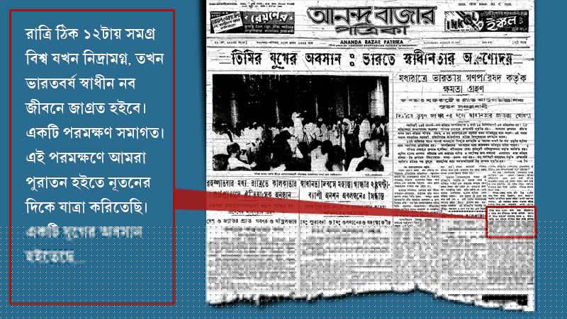 টিক যেমনটা বলেছিলেন জওহরলাল নেহরু। সেই রাতে দেশবাসীর উন্মাদনা তুঙ্গে। সদ্য স্বাধীন হয়েছে দেশ। তার মধ্যেই জাতির উদ্দেশে সংসদে দাঁড়িয়ে প্রধানমন্ত্রী নেহরু ভাষণ দিচ্ছেন। ১৯৪৭-এর ১৫ অগস্ট মধ্যরাতে সংসদের ওই অধিবেশনে নেহরু বলেছিলেন, ‘রাত ঠিক ১২টায় গোটা বিশ্ব যখন নিদ্রামগ্ন, তখন ভারতবর্ষ স্বাধীন নব জীবনে জাগ্রত হবে। একটি পরম ক্ষণ সমাগত। এই পরম ক্ষণে আমরা পুরনো থেকে নতুনের দিকে যাত্রা করছি। একটি যুগের অবসান হচ্ছে...’। নতুন ভারতের জন্ম ক্ষণে সেই রাত ছিল সত্যি সত্যিই নতুন যুগে প্রবেশের শুভ ক্ষণ।