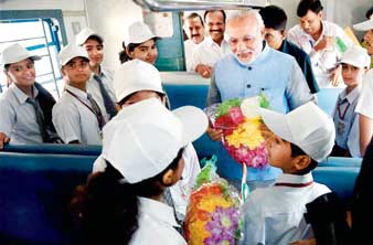 ট্রেনে কচিকাঁচাদের সঙ্গে প্রধানমন্ত্রী নরেন্দ্র মোদী। কাটরায় শুক্রবার।
