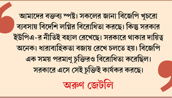 সরকারের এক বছর পূর্তি উপলক্ষে বিজেপির সদর দফতরে সাংবাদিক বৈঠক। জেটলির কাছে জানতে চাওয়া হয়, বাণিজ্যমন্ত্রী নির্মলা সীতারামণ বহু ব্র্যান্ডের খুচরো ব্যবসায় ৫১ শতাংশ পর্যন্ত বিদেশি লগ্নির সিদ্ধান্ত প্রত্যাহারের ইঙ্গিত দিয়েছেন। সরকার কী পদক্ষেপ করছে? মোদীর সেনাপতির ব্যাখ্যা, ‘‘বক্তব্য স্পষ্ট। সকলের জানা বিজেপি এর বিরোধিতা করছে। কিন্তু সরকার ইউপিএ-র নীতিই বহাল রেখেছে।’’