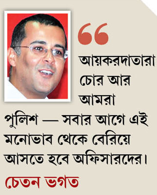 হংকংয়ে ইনভেস্টমেন্ট ব্যাঙ্কারের চাকরি ছেড়ে লেখক-জীবন শুরু করা চেতনের মতে, ‘আয়করদাতারা চোর আর আমরা পুলিশ’— সবার আগে এই মনোভাব থেকে বেরিয়ে আসতে হবে অফিসারদের। যাঁরা কর দিচ্ছেন, তাঁদের ‘খদ্দের-ভগবান’ হিসেবে দেখতে হবে। সম্প্রতি এক নিবন্ধে চেতন লিখেছেন, কর জমা দেওয়ার ফর্মগুলির সুন্দর নাম দিতে হবে। এমনিতেই কর জমা দিতে গিয়ে ভুলভ্রান্তির ভয় থাকে। তার পর ‘আইটিআর-ফোর’, ‘২৬-এএস’— এই সব নাম শুনলেই লোকে ভয় পেয়ে যান। চেতনের উপদেশ, আয়কর জমার ফর্ম কত সহজ-সরল হতে পারে, তা বোঝার জন্য এ দেশের অফিসাররা হংকং-সিঙ্গাপুরের ফর্মগুলো ডাউনলোড করে দেখতে পারেন।
