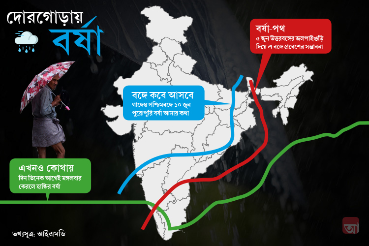 নির্ধারিত সময়ের আগেই বর্ষা ঢুকে পড়লেও তা নিয়ে এর আগে বেশ আশঙ্কাতে ছিলেন আবহবিদদের একাংশ। চলতি বছরে গ্রীষ্মের প্রবল দাপট না থাকায় তাঁদের ধারণা ছিল, মৌসুমী বায়ুর দাপট তেমনটা হবে না। তবে সম্প্রতি আরব সাগরে একটি গভীর নিম্নচাপ ঘূর্ণিঝড় হয়ে আছ়়ড়ে প়ড়ায় শক্তি বাড়ে মৌসুমী বায়ুর। তাতেই আশার আলো দেখছেন আবহবিদরা। সব কিছু ঠিকঠাক থাকলে স্বাভাবিক সময়ে অর্থাৎ আগামী ১০ জুন এ বাংলায় দেখা দিতে পারে বর্ষার মেঘ।