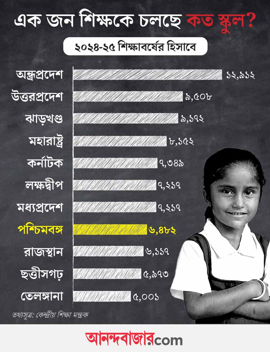 উত্তরপ্রদেশে এক জন শিক্ষক নিয়ে চলা এই স্কুলগুলিতে রয়েছে ৬,২৪,৩২৭ জন পড়ুয়া। ঝাড়খণ্ডে এই ধরনের স্কুলগুলিতে ৪,৩৬,৪৮০ জন পড়ুয়া ভর্তি রয়েছে। পশ্চিমবঙ্গের ক্ষেত্রে ২,৩৫,৪৯৪ জন পড়ুয়া এই স্কুলগুলিতে পড়াশোনা করে। কেন্দ্রের তথ্য বিশ্লেষণ করলে দেখা যায়, ২০২৪-২৫ শিক্ষাবর্ষ অনুসারে, রাজ্যে এমন স্কুলগুলিতে গড়ে ৩৬ জন করে পড়ুয়া পড়াশোনা করে। এ ছাড়া মধ্যপ্রদেশে এমন স্কুলগুলিতে ২,২৯,০৯৫ জন, কর্নাটকে ২,২৩,১৪২ জন, অন্ধ্রপ্রদেশে ১,৯৭,১১৩ জন এবং রাজস্থানে ১,৭২,০৭১ জন পড়ুয়া ভর্তি রয়েছে।