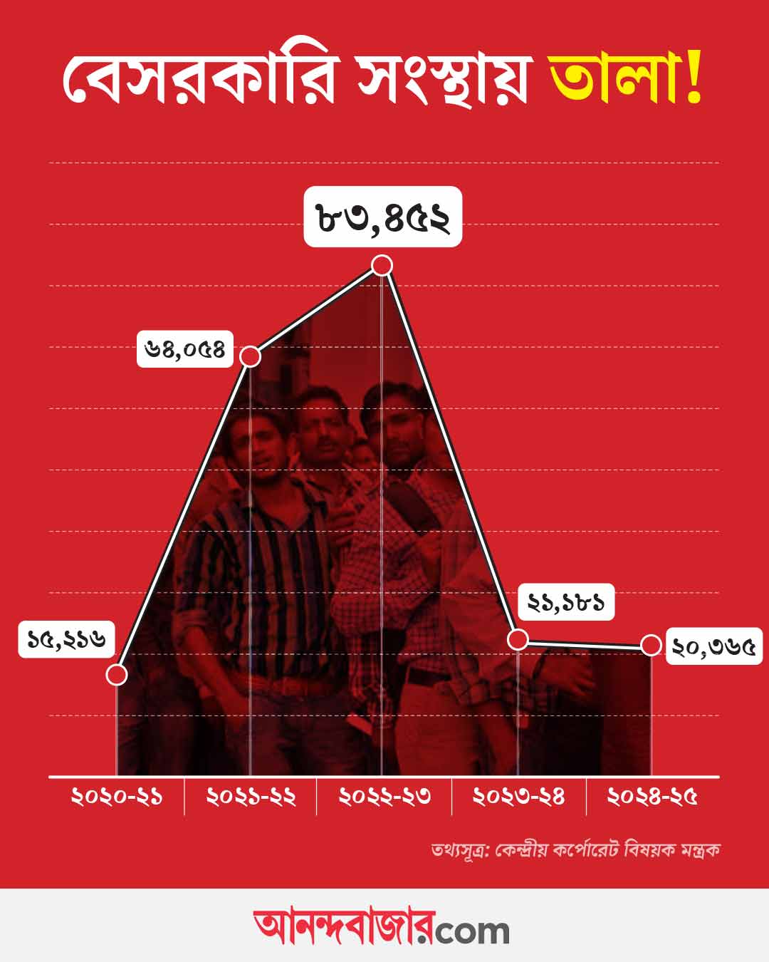 কেন্দ্রীয় মন্ত্রীর দেওয়া তথ্য অনুসারে, ২০২০-২১ সালে ১৫,২১৬টি এবং ২০২৩-২৪ সালে ২১,১৮১টি সংস্থা বন্ধ হয়েছে। অর্থাৎ, পাঁচ বছরের মধ্যে নির্দিষ্ট ভাবে কোভিড এবং কোভিড পরবর্তী সময়েই যে অনেক বেশি সংস্থায় তালা ঝুলেছে, তা সরকারি হিসাবেই স্পষ্ট। মন্ত্রী জানান, এই দু’লক্ষেরও বেশি সংস্থার মধ্যে কোনও ক্ষেত্রে সংস্থাটি অন্য সংস্থার সঙ্গে মিশে গিয়েছে, কোনও সংস্থা অন্য নামে রূপান্তরিত হয়েছে আবা কোনওটি পুরোপুরি বিলুপ্ত হয়ে গিয়েছে। সেগুলিকে ২০১৩ সালের কোম্পানি আইনের আওতায় তালিকা থেকে বাদ দিয়ে দেওয়া হয়েছে।