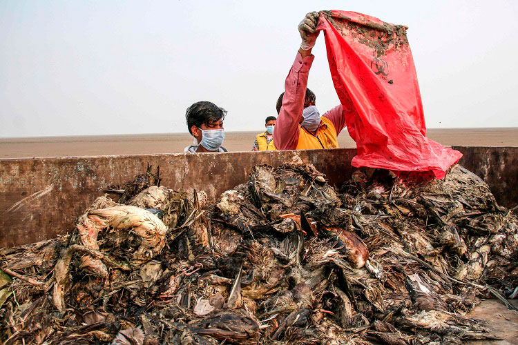 সরিয়ে ফেলা হচ্ছে পাখিদের মৃতদেহ। ছবি: এএফপি।
