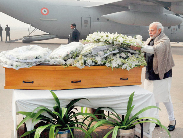 মুফতি মহম্মদ সইদের শেষ যাত্রায় শ্রদ্ধা জানাচ্ছেন প্রধানমন্ত্রী নরেন্দ্র মোদী। বৃহস্পতিবার নয়াদিল্লির বিমানবন্দরে। ছবি: পিটিআই।
