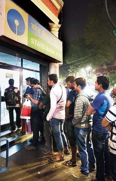 এটিএমে টাকা তোলার লাইন। মঙ্গলবার ধর্মতলায় সুমন বল্লভের তোলা ছবি।