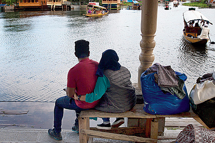 উদ্বেগ: শ্রীনগর ছাড়ার অপেক্ষায় পর্যটক দম্পতি। শনিবার। ছবি: এপি।