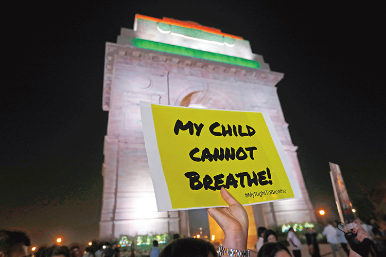 আন্দোলন: বায়ুদূষণ নিয়ন্ত্রণের দাবিতে ইন্ডিয়া গেটের সামনে প্ল্যাকার্ড হাতে এক প্রতিবাদী। মঙ্গলবার নয়াদিল্লিতে। ছবি: রয়টার্স।