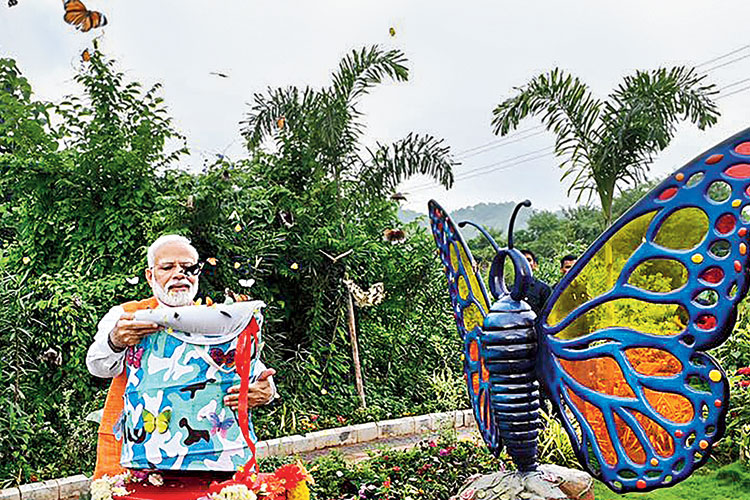 জন্মদিনে বন্দি প্রজাপতিদের মুক্ত করছেন নরেন্দ্র মোদী। মঙ্গলবার গুজরাতের কেবাডিয়ায়। ছবি: পিটিআই।