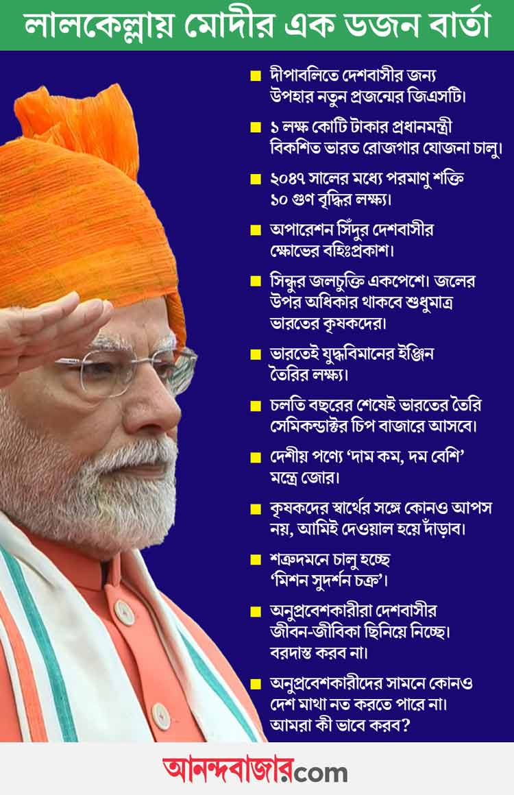 লালকেল্লার ভাষণে মোদী বলেন, ‘‘স্বাধীনতার পর সকলের জন্য খাদ্য নিশ্চিত করা একটি বড় চ্যালেঞ্জ ছিল। কিন্তু আমাদের কৃষকেরা আমাদের স্বাবলম্বী করে তুলেছেন। তাই ভারত সরকার কৃষকদের স্বার্থের সঙ্গে কোনও আপস করবে না। দেওয়াল হয়ে দাঁড়িয়ে থাকবে মোদী।’’