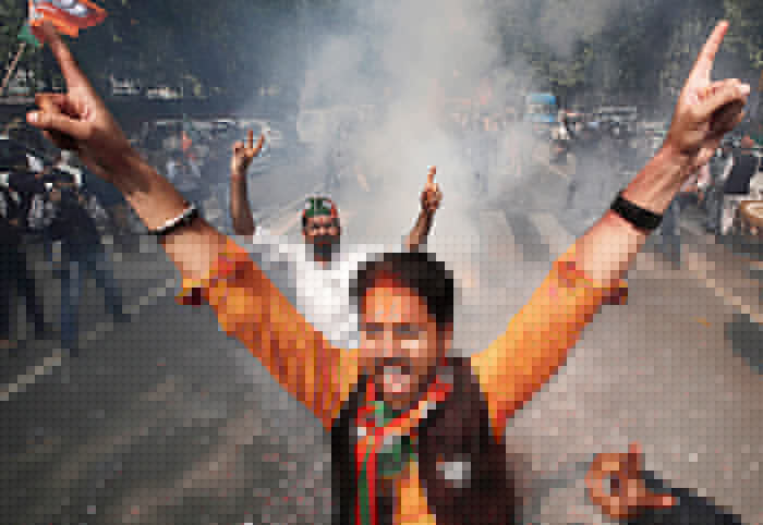 আমোদিত: বিজেপির জয়ের খবরে আনন্দে ফেটে পড়েছেন সমর্থকরা। নয়াদিল্লিতে শনিবার দলের সদর দফতরের বাইরে। ছবি: রয়টার্স।