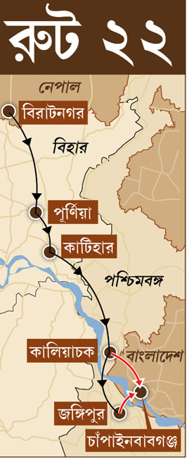 কোন পথে একে-২২ রাইফেল বাংলাদেশে পাড়ি দিচ্ছে, সে বিষয়ে ভারতীয় গোয়েন্দাদের বেশ কিছু গুরুত্বপূর্ণ তথ্য দিয়েছে ও দেশের পুলিশ। তারা জানাচ্ছে, নেপাল থেকে বিহারে আসা একে-২২ পশ্চিমবঙ্গের মালদহ-মুর্শিদাবাদ জেলা হয়ে পৌঁছে যাচ্ছে বাংলাদেশের চাঁপাইনবাবগঞ্জে। সেখান থেকে তা যাচ্ছে জঙ্গিদের হাতে। বাংলাদেশে জঙ্গিদের ভাঁড়ারে একে-২২ রাইফেলের ভাল মজুত রয়েছে বলেও জানিয়েছেন সে দেশের গোয়েন্দা কর্তারা।