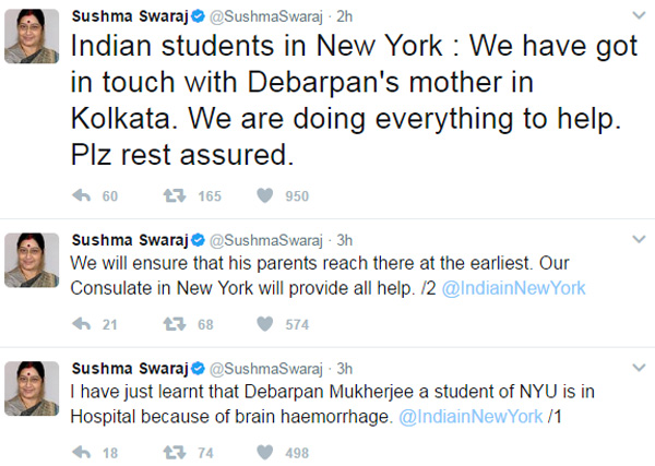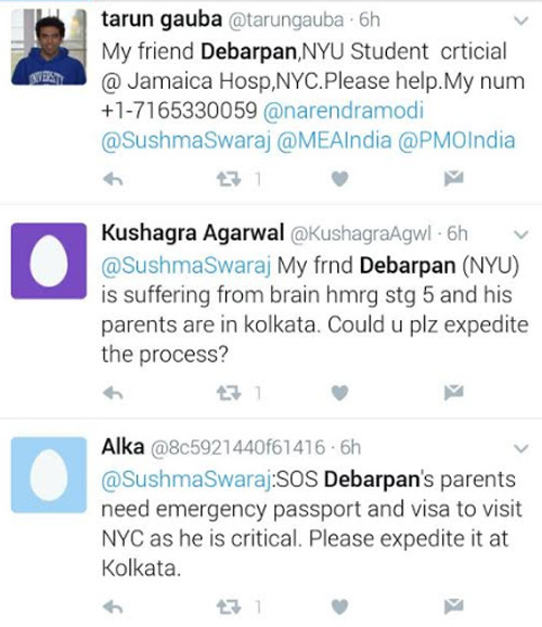 এর পরই এই অসুবিধার কথা জানিয়ে সাহায্য চেয়ে সুষমার টুইটার অ্যাকাউন্টে পরপর কতগুলো টুইট করা হয়। দেবর্পনের নিউ ইয়র্কের বন্ধুরাই টুইটগুলি করেছিলেন। টুইটে তাঁরা বিদেশমন্ত্রী সুষমাকে অনুরোধ করেন, দেবার্পণের বাবা-মার জন্য এমারজেন্সি পাসপোর্ট এবং ভিসার ব্যবস্থা করে দেওয়ার জন্য।