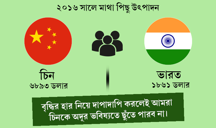 সরকার পক্ষ বলবে বাণিজ্যের সুবিধার নিরিখে ভারতবর্ষের স্থান ১৩০ থেকে ১০০ তে উঠে এসেছে। আরও বলবে যে বিমুদ্রাকরণের প্রাথমিক ধাক্কা পেরিয়ে আমাদের বৃদ্ধির হার ফের গতিবেগ ফিরে পেয়েছে। আমাদের গতিবেগ চিনকে ছুঁয়ে ফেলেছে অথবা ছাড়িয়ে গিয়েছে। কেবল বলবে না যে, বৃদ্ধির হার দিয়ে অর্থনৈতিক বিকাশ মাপা যায় না। বলবে না, কারণ তারা এ ব্যাপারটা আদৌ বোঝে কি না সন্দেহ। ২০১৬ সালে চিনের মাথা পিছু উৎপাদন ছিল ৬৮৯৩ ডলার আর ভারতের ছিল ১৮৬১ ডলার। বৃদ্ধির হার নিয়ে দাপাদাপি করলেই আমরা চিনকে অদূর ভবিষ্যতে ছুঁতে পারব না। বৃদ্ধির প্রয়োজন নেই এমন নয়। কিন্তু বৃদ্ধি আমাদের জীবনযাত্রার মানের সূচক নয়।