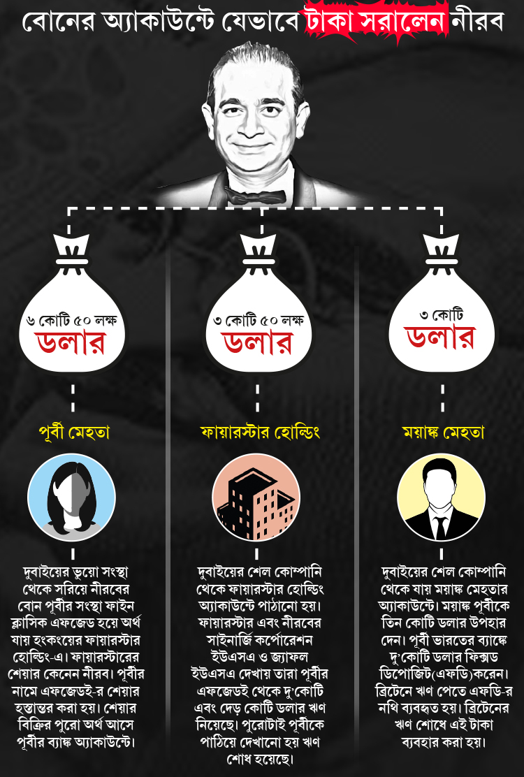 একা নীরব মোদী নন। প্রতারণা চক্রে তার সঙ্গে ছিলেন বোন পূর্বী মেহতা এবং ভগ্নিপতি ময়াঙ্ক মেহতা। নীরব মোদী যে ব্যাঙ্ক প্রতারণার টাকা পূর্বী এবং মায়াঙ্কের অ্যাকাউন্টে সরিয়ে ফেলেছিলেন, তা সাম্প্রতিক তদন্তে ধরা পড়েছে।