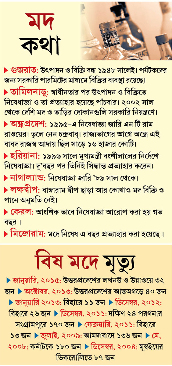 মদ বিক্রিতে উপর নিষেধাজ্ঞা জারির তালিকায় সর্বশেষ কেরল। সেই পথে চলার কথা ভাবতে শুরু করেছে মহারাষ্ট্রও। তবে কেরল কংগ্রেসের এক নেতা তথা প্রাক্তন কেন্দ্রীয় মন্ত্রীর কথায়, ‘‘কেরলেও কালোবাজারি শুরু হয়ে গিয়েছে। সৈকতাবাসে গিয়ে মদের কথা বলতেই বেয়ারা পসরা সাজিয়ে নিয়ে আসে।’’ হরিয়ানাতেও একাধিক বার মদ বিক্রির উপর নিষেধাজ্ঞা জারি হয়েছে। কিন্তু কয়েক বছরের মধ্যেই তা প্রত্যাহার করতে হয়েছে সরকারকে। অবিভক্ত অন্ধ্রে এনটিআরের শাসনের শেষ দিকে একই ভাবে নিষিদ্ধ হয়েছিল মদ। কিন্তু বিষ মদে মৃত্যুতে জেরবার এই সব রাজ্যে শেষ পর্যন্ত নিষেধাজ্ঞা তুলে নেওয়া হয়। মদ বন্ধ করা নিয়ে তামিলনাড়ুতেও রাজনৈতিক লড়াই কম হয়নি। অন্তত পাঁচ দফায় নিষেধাজ্ঞা আরোপ হয়েছে, আবার তুলেও নেওয়া হয়েছে। শেষ পর্যন্ত এখন তামিলনাড়ুতে দেশি মদ ও তাড়ির দোকানগুলিকে সরকারি রাজস্বের জালে আনা হয়েছে। সরকারি নিগমের মাধ্যমে মদ বিক্রির ব্যবস্থাও করা হয়েছে। গত আর্থিক বছরে এই খাতে তামিলনাড়ু সরকারের রাজস্ব আদায় হয়েছে ২৬ হাজার কোটি টাকা! আর বাণিজ্য কর বাবদ আয় হয়েছে ১৯ হাজার কোটি টাকা! মহারাষ্ট্রে মদ বিক্রি থেকে রাজ্যের শুল্ক আদায় হয় প্রায় ১১ হাজার কোটি টাকা। অভিভক্ত অন্ধ্রপ্রদেশে এই খাতে আদায়ের পরিমাণ ছিল সাড়ে ১৬ হাজার কোটি টাকা।